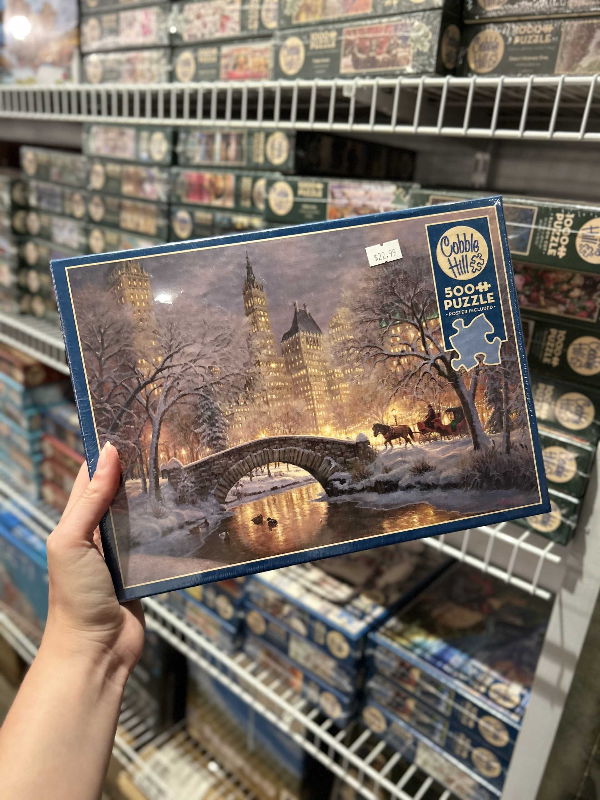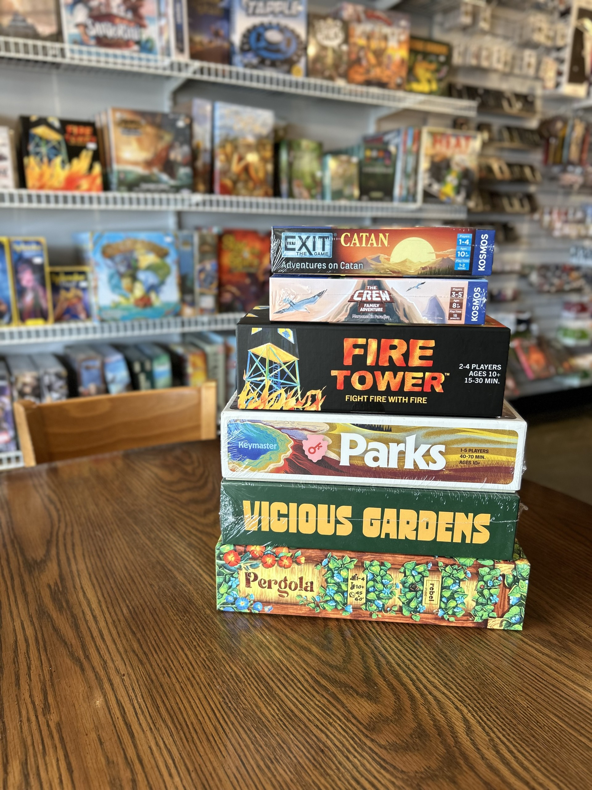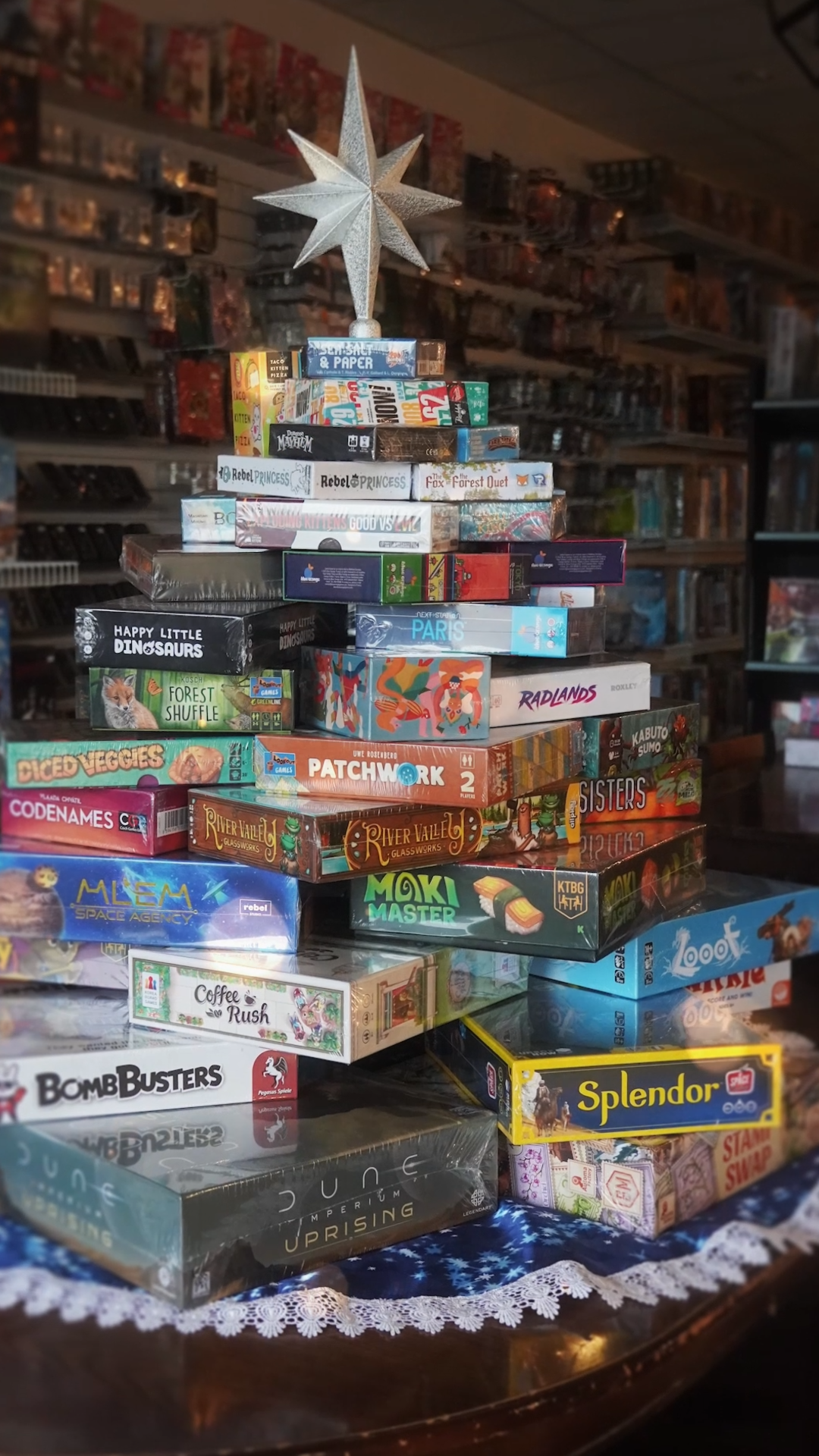 Selling board games and their accessories (card sleeves, card boxes, tokens, etc.). Dungeons and Dragons/Role Playing games and their accessories (dice, miniatures, books, pins, stickers, etc.). Jigsaw puzzles, squishable, fidget toys, and other stuffies.